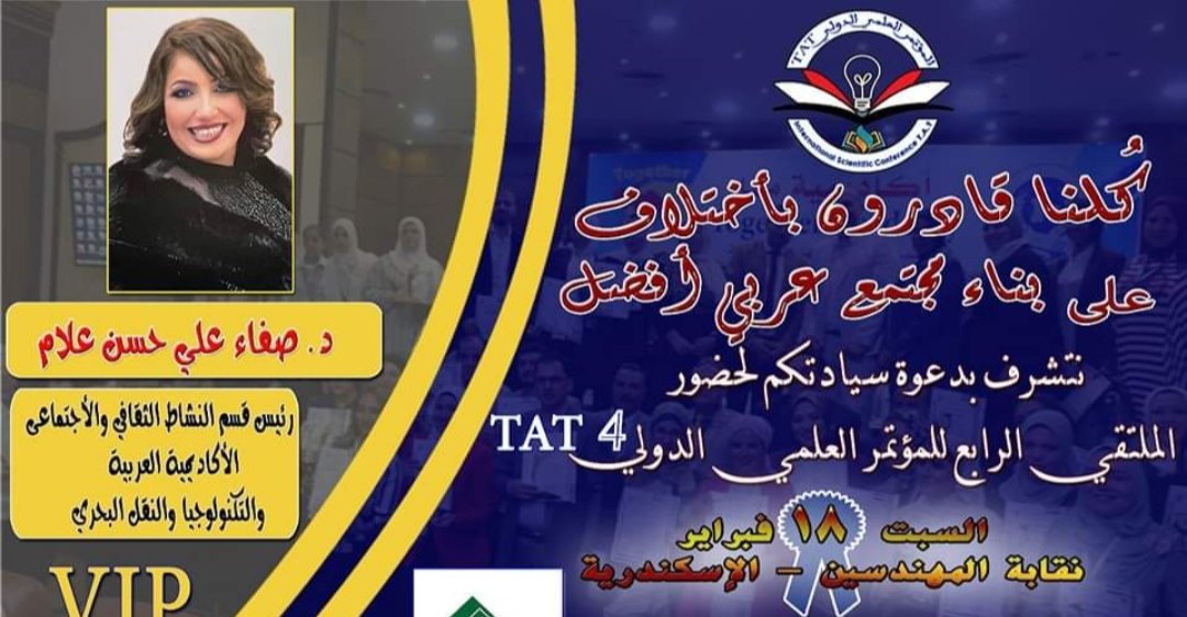 والجدير بالذكر أن القائمين على مؤتمر( قادرون باختلاف لبناء وطن عربي أفضل) قد أرسلوا دعوة حضور،و تكريم للدكتورة صفاء علي حسن علام رئيس قسم النشاط الثقافي ،و الاجتماعي للأكاديمية العربية و التكنولوجيا و النقل البحري من أجل حضورها ،و تكريمها بالمؤتمر، و قد توجهت بالشكر للدكتور روبرت إدوار رئيس المؤتمر ،و جميع القائمين عليه ،ومن هنا فإن أسرة الجريدة تتقدم بالتهنئة مقدما لكلا من الدكتور روبرت إدوار ،و الدكتورة سارة عبد اللطيف على نجاح المؤتمر ،و تتمنى لهم دوام النجاح،و التوفيق في جميع أعمالهم، وخطواتهم القادمة .